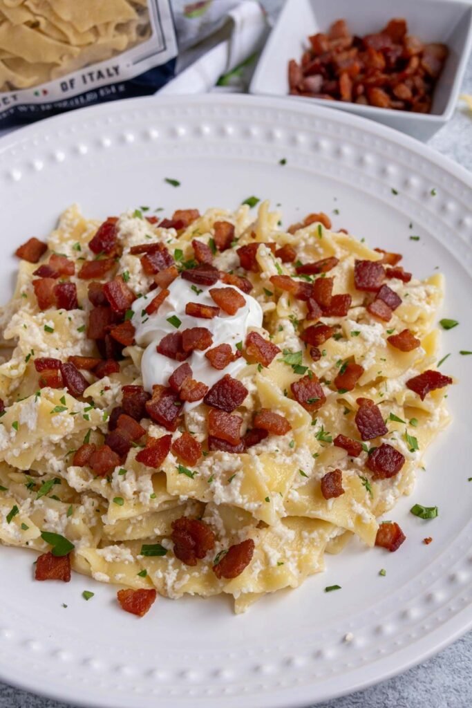 🇭🇺 Hungarian Pasta with Cottage Cheese and Bacon (Túrós Csusza) 📝 Ingredients 300g (10 oz) wide egg noodles or pasta 200g (1 cup) cottage cheese (or farmer’s cheese) 150g (5 oz) bacon, diced 100ml (½ cup) sour cream Salt to taste Black pepper (optional) INTRODUCTION Related Posts:Hungarian Cottage Cheese Pasta🇭🇺Túrós Csusza (Hungarian Cottage Cheese Noodles)🇭🇺..Hungarian pasta with cottage cheese and bacon (Túrós Csusza)Hungarian Cottage Cheese Dumplings (Túrógombóc) – A…Cheesy Chicken Bacon Ranch Pasta Bake: A Comfort…simple and delicious vegetable dish with hamRakott Tészta: The Comforting Hungarian Baked…Hungarian Cottage Cheese Pasta | Culinary Immigration🇭🇺Hungarian Cottage Cheese🇭🇺.Hungarian Cottage Cheese Noodles🇭🇺. Pages: 1 2