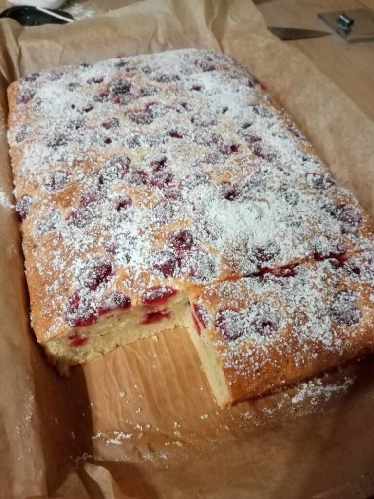Pour batter into a greased or lined baking pan. - Evenly distribute sour cherries over the top (they will sink slightly).