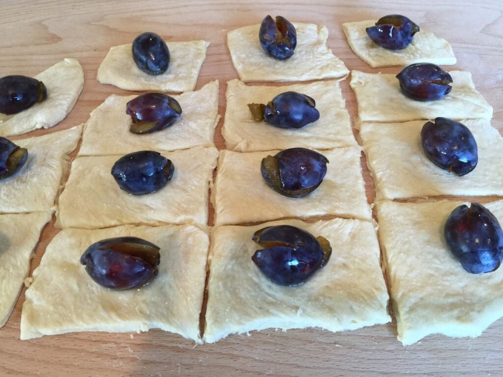 - Place a plum (or half) in the center, wrap the dough around, and pinch to seal.
