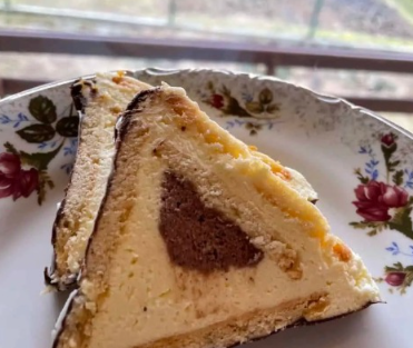 ✨ When sliced, the inside shows a beautiful triangle of white cheese filling inside a chocolate-and-biscuit shell – like a little hut!