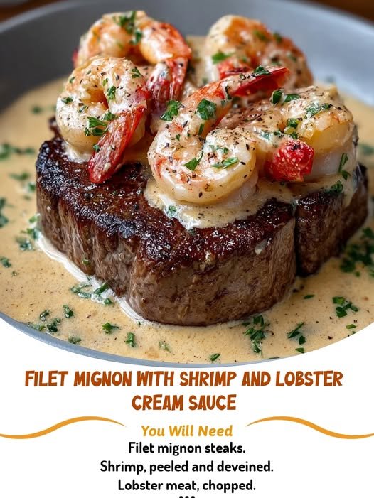 Perfectly seared filet mignon topped with a rich, garlicky shrimp & lobster cream sauce.