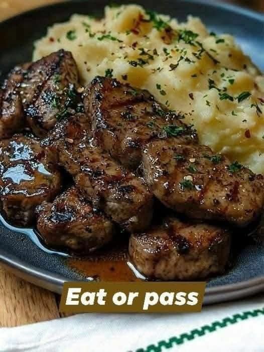 - Plate creamy mashed potatoes and top with garlic butter steak bites.
