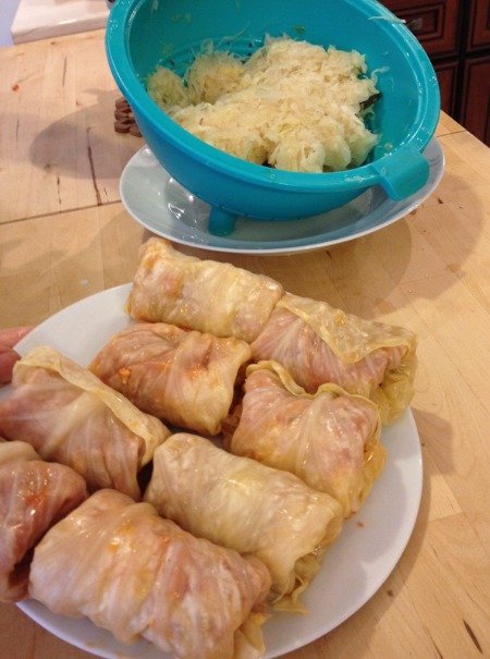 - Arrange stuffed cabbage rolls seam-side down over the sauerkraut.
