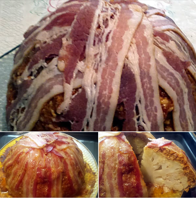 - Lay the bacon slices on parchment paper in a circular pattern, overlapping from a central point. Place the cauliflower in the center and cover it with the seasoned meat mixture. Fold the bacon slices over the top to enclose everything.