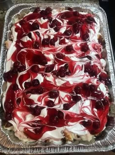 The image shows a dessert that appears to be a Cherry Cheesecake Roll or a similar layered dessert. It features layers of creamy filling, graham cracker crust, and a vibrant red cherry topping, with a marbled effect on top. This type of dessert is often served as a festive or holiday treat. Here’s a detailed recipe for making this delightful dessert: