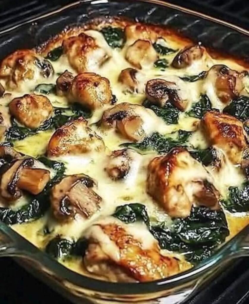 Here’s a creamy, low-carb Chicken Spinach Mushroom Oven Dish — perfect for keto or lighter dinners 🥬🍄🍗