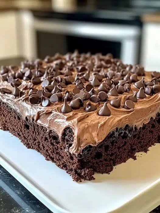 - Prepare chocolate cake according to box instructions. Bake in a 9×13-inch pan. Cool slightly.