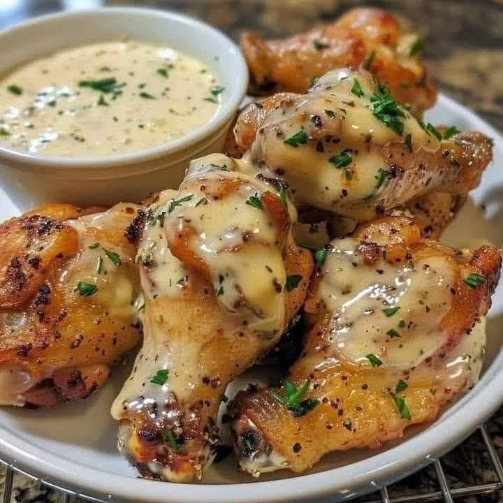- Toss baked or fried wings in the warm garlic Parmesan sauce until evenly coated.