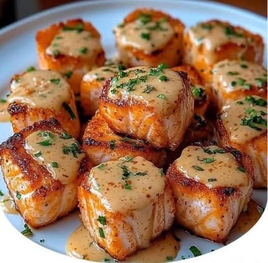 Pat the salmon fillets dry with paper towels to ensure a crispy texture. Remove any skin and cut the salmon into 1-inch bite-sized cubes.