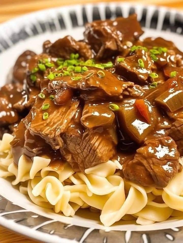 - Spoon beef and gravy over noodles.