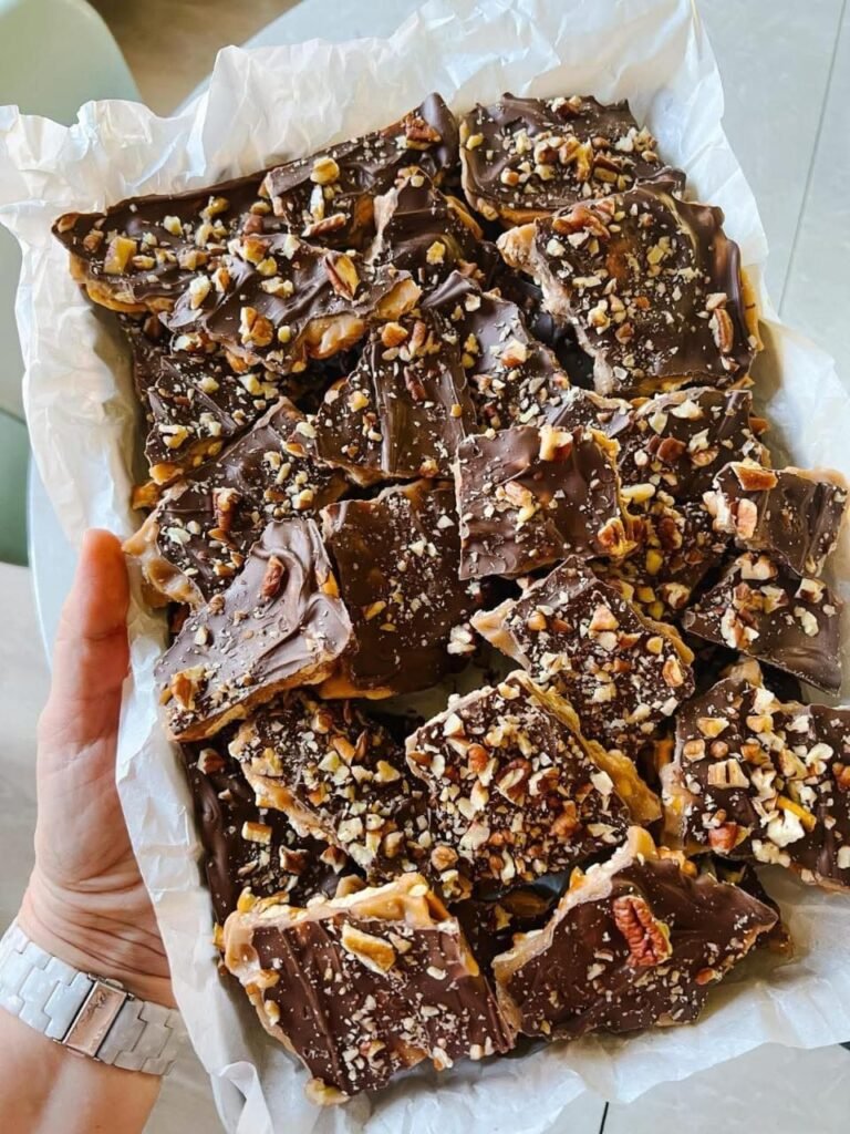 - Sprinkle the chopped chocolate over the hot toffee immediately. Let it sit for 1–2 minutes to melt.