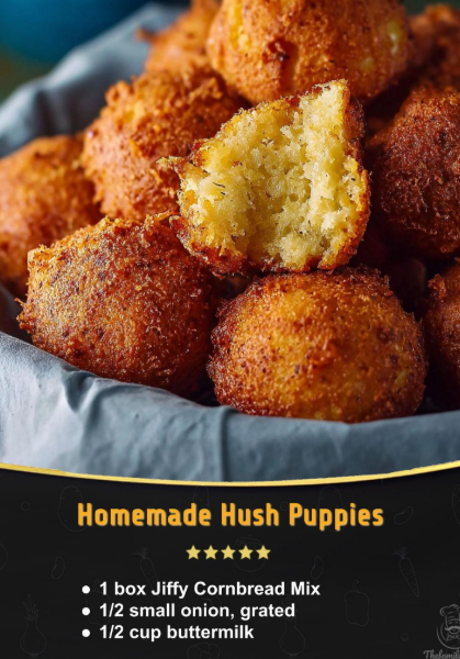 - Fry hush puppies – Drop spoonfuls of batter (about 1 tbsp each) into the hot oil. Fry in small batches until golden brown, about 2–3 minutes per side.