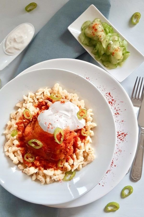 - Place spaetzle on plates, top generously with chicken and paprika sauce, and garnish with parsley if desired.