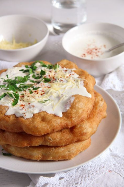 Enjoy hot, fresh from the fryer—crispy on the outside, soft and chewy inside! Lángos is usually eaten as street food in Hungary, especially at fairs and markets.