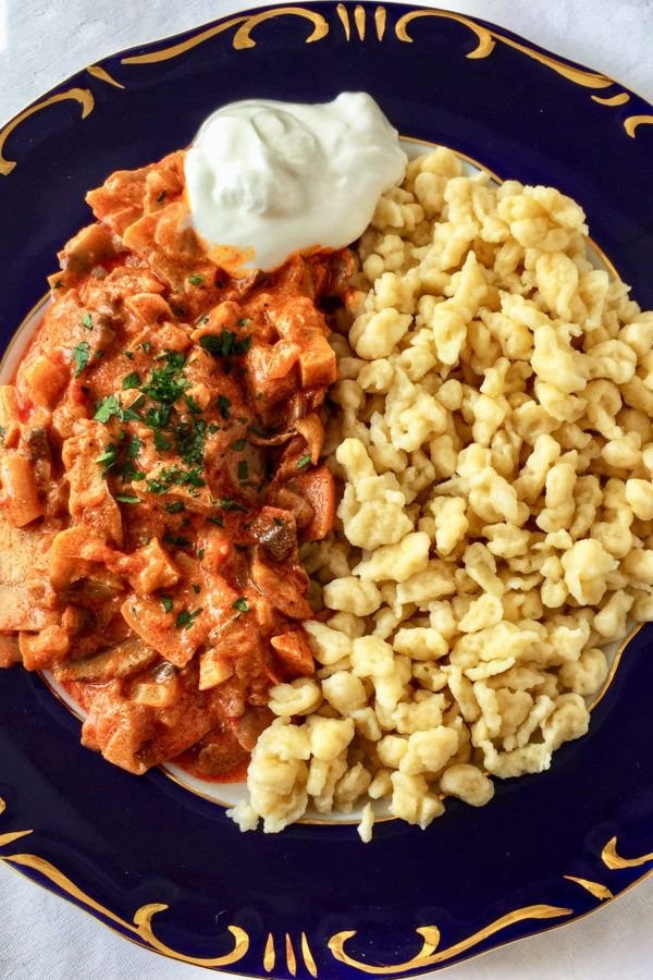 - Nokedli (Hungarian egg noodles) or buttered spaetzle