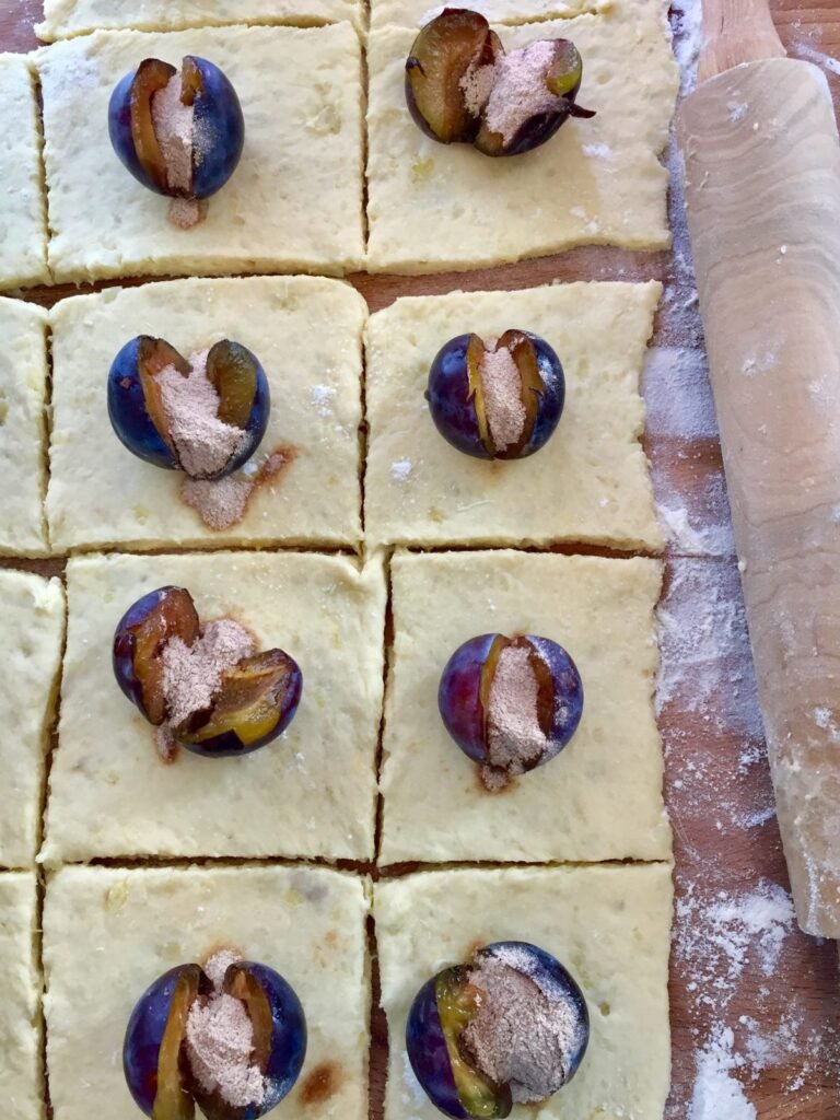 - Take a small piece of dough (about the size of a golf ball), flatten it in your hand, place a plum half inside, and carefully wrap the dough around it, sealing completely. Repeat with remaining dough and plums.