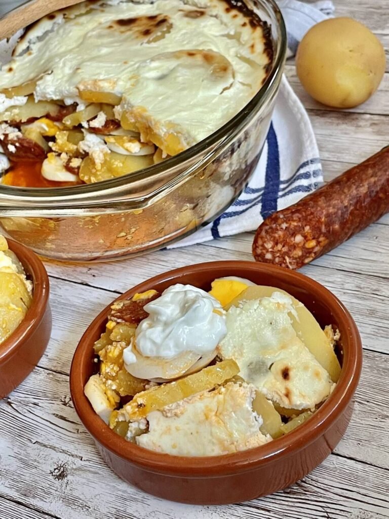 - Repeat the layers until all ingredients are used, finishing with potatoes on top.