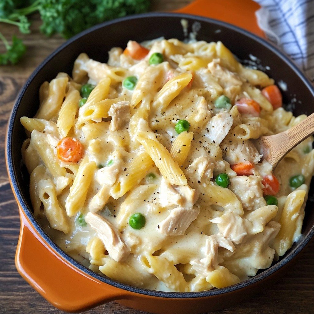This Creamy Chicken Pot Pie Pasta is like a warm hug in a bowl! It’s an easy comfort meal that the whole family will love. 🍲