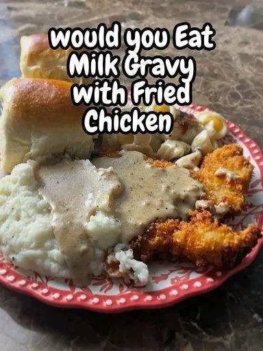 - Place fried chicken on a platter, pour milk gravy over the top (or serve on the side).
