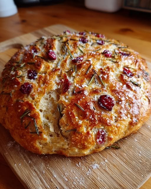 In a large bowl, combine flour, salt, and yeast. Stir in water until a sticky dough forms. Fold in cranberries and rosemary.
