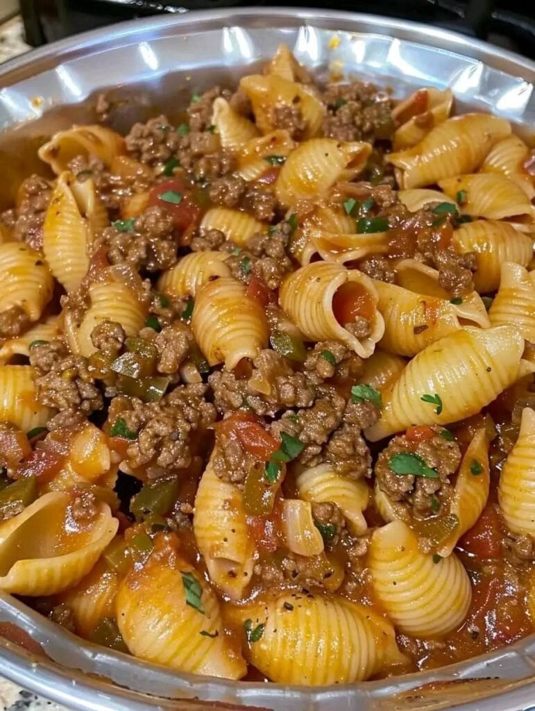 - Once the sauce has thickened, add the cooked pasta to the skillet with the ground beef mixture. Toss everything together until the pasta is well coated in the sauce.