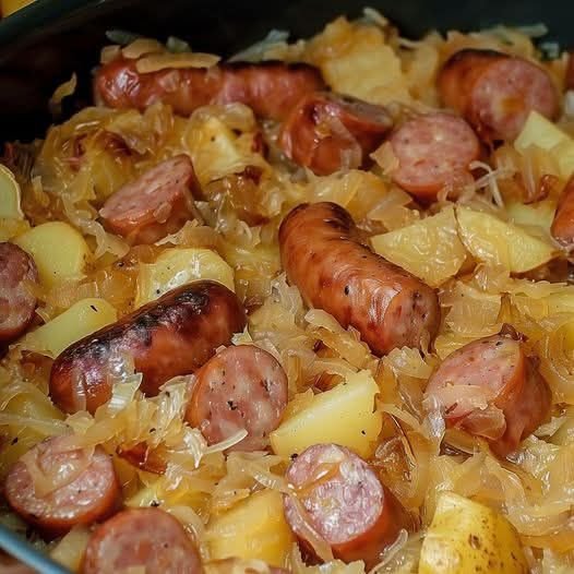 Toss in the potatoes, season with pepper and (optional) caraway seeds. Sauté for 3–4 minutes to get them lightly browned. - Add sauerkraut & sausage back: