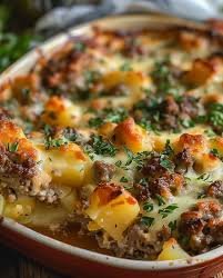 - Spread the beef and vegetable mixture on top of the potatoes.
