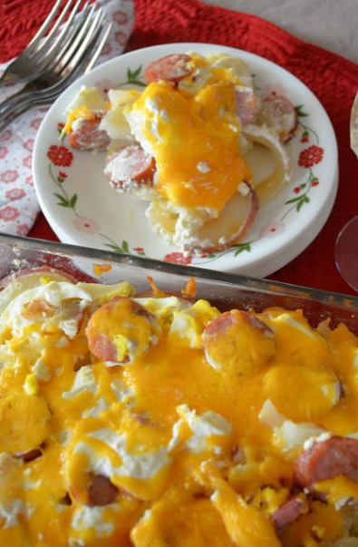 Cut the potatoes, eggs, and sausage into even slices. - Grease the dish: