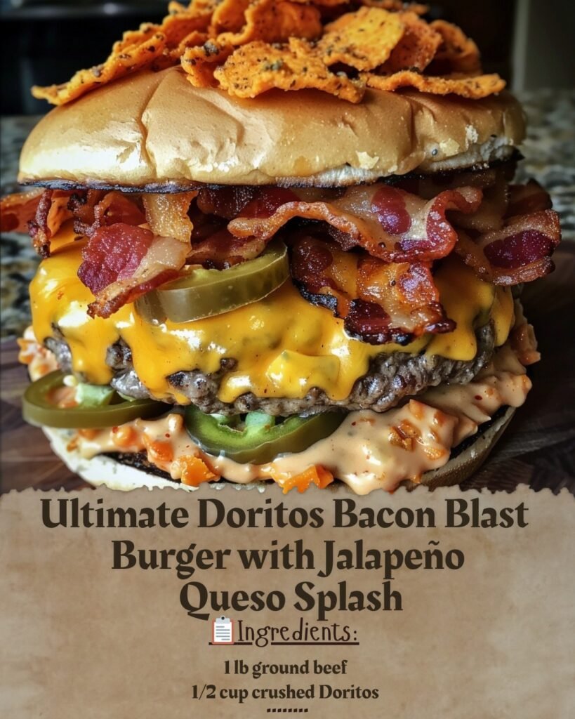 The Ultimate Doritos Bacon Blast Burger with Jalapeño Queso Splash is loaded, cheesy, spicy, crunchy — basically a party in every bite. Here’s how to make it step by step: